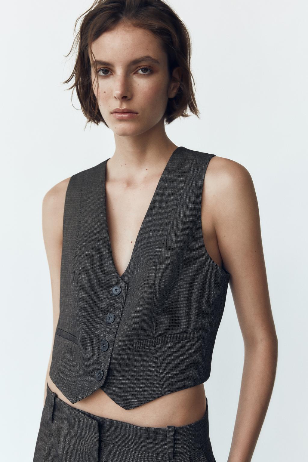 Ärmellose Weste mit V-Ausschnitt. Aufgesetzte Taschen vorne. Knopfverschluss vorne.